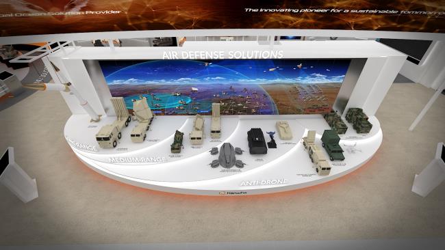 전시장 중앙에는 한화시스템이 개발해 미사일 위협을 탐지하는 중∙장거리용 다기능레이더(MFR), 다표적 동시교전 다기능레이다와 함께 한화에어로스페이스가 개발한 장거리 요격미사일이 첫 전시됐다. ‘안티 드론존’에는 세계 최초로 전력화된 한화에어로스페이스의 레이저 대공무기 및 적 드론을 방어하기 위해 출격하는 레일형 발사대 등이 공개됐다. 고도 10km 이하 저고도 위협을 방어할 수 있는 무기체계로 드론 공격을 효과적으로 방어할 수 있다.