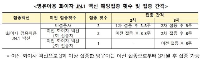 영유아용 화이자 백신(JN.1)은 이전에 접종한 화이자 백신(초기주, XBB.1.5 백신) 접종 횟수에 따라 최대 3회까지 접종이 필요하므로 의료진과 상담을 거쳐 접종해야 한다. 이전 화이자 백신으로 접종을 2회 이상 접종한 영유아는 신규 백신으로 1회, 화이자 백신으로 1회 접종한 영유아는 신규 백신으로 2회 접종이 필요하다. 이전 접종력이 없는 영유아는 모더나 백신과 화이자 백신 중 선택하여 접종 가능하다.