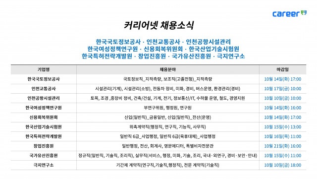 취업 포털 커리어가 한국국토정보공사, 인천교통공사, 인천공항시설관리, 한국여성정책연구원, 신용회복위원회, 한국산업기술시험원, 한국특허전략개발원, 창업진흥원, 국가유산진흥원, 극지연구소의 채용 소식을 발표했다.
