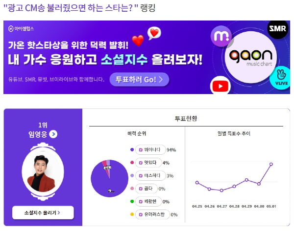 익사이팅디시에서 지난 4월 25일부터 5월 1일까지 진행한 '광고 CM송 불러줬으면 하는 스타는?'이라는 제목의 투표에서 임영웅은 총 투표수 38만2484표 중 과반수가 넘는 19만4240표(51%)를 얻으며 압도적인 인기를 과시했다.