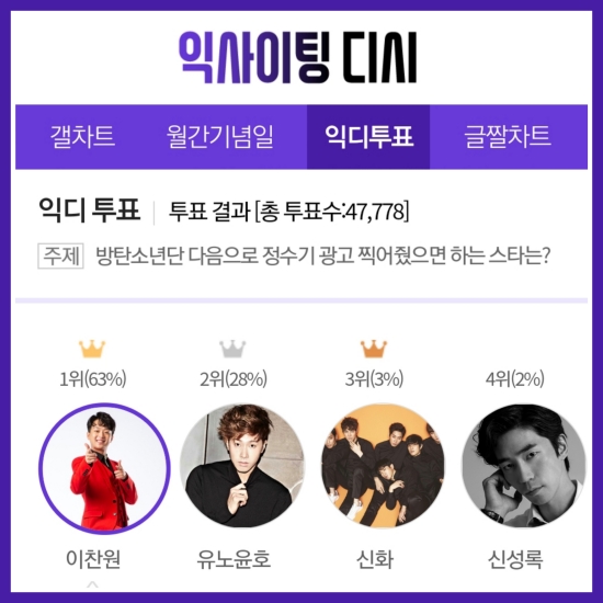 지난 13일부터 19일까지 '익사이팅디시'에서 투표가 진행됐고 이찬원은 3만150표를 획득해 1위에 올랐다. 전체 투표수의 63%에 해당하는 압도적인 지지였다. 2위는 유노윤호, 3위는 신화가 차지했다.