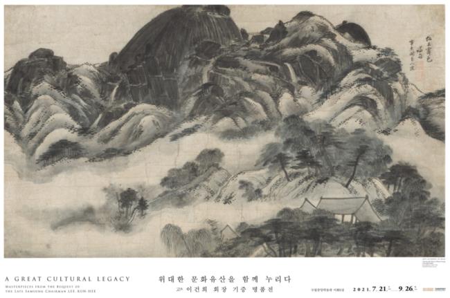 국립중앙박물관은 '위대한 문화유산을 함께 누리다- 고 이건희 회장 기증 명품전'을 열고 유족을 통해 기증받은 2만1600점 중 시대를 대표하는 문화재 77점(국보 12건·보물 16건)을 엄선해 공개한다. 조선 화가 겸재 정선의 '인왕제색도', 조선 풍속 화가 김홍도의 '추성부도', 고려 불화 '천수관음보살도' 등이다.