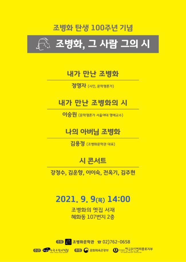 '조병화, 그 사람 그의 시' 문학행사는 '2021 지역문학관 특성화 프로그램'의 하나로 조병화문학관이 주최하고, 사단법인 한국문학관협회가 주관하며, 문화체육관광부와 사단법인 한국문인협회 종로지부가 후원한다.