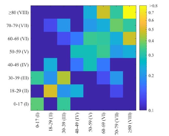 국가수리과학연구소와 대한수학회가 공동 운영하는 '코로나19 수리모델링 태스크포스'는 최근 '수리모델링으로 분석한 코로나19 유행 예측'이라는 제목의 보고서를 공개했다. 이에 따르면, 정부의 현행 사회적 거리 두기 방침이 연말까지 계속되고 동시에 18~49세 연령층의 백신 접종률이 높아질 경우 하루 신규 확진자 수가 100명 아래로 줄어들 것으로 전망됐다. 접종률이 높아지더라도 현행 거리 두기 단계를 완화하면 신규 확진자 수는 현재와 같이 네 자릿수를 이어갈 것이라는 예측도 함께 나왔다. 연구진은 사람들이 자주 접촉하는 연령대가 서로 다르다는 점에 착안, 연령군(群) 간 감염 전파율을 추정한 '수학 행렬표'도 만들었다. 이에 따르면 '80대(代) 이상'의 감염 전파율이 가장 높았다. 수치상 일부 차이가 있었지만 비슷한 연령대의 감염 전파율은 비교적 높게 나타났다. 이는 또래 집단 간 모임에 의해 코로나가 전파되고 있음을 보여준다.
