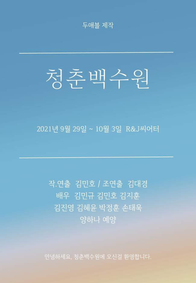 연극 청춘백수원은 극단 두애블의 초연 창작극으로 취업을 희망하는 현대사회의 20~30대의 청년들이 청춘백수원이란 장소에 모여 취업을 위한 특훈을 받으며 일어나는 사건을 담았다.
