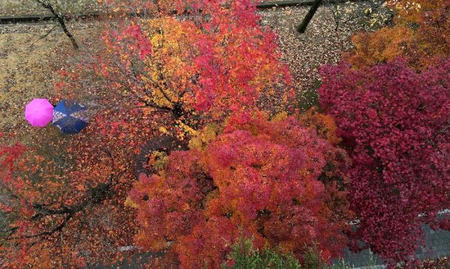 2021년 11월 10일 오후 비가 내린 국립대전현충원 산책로가 단풍으로 곱게 물들어 있다.