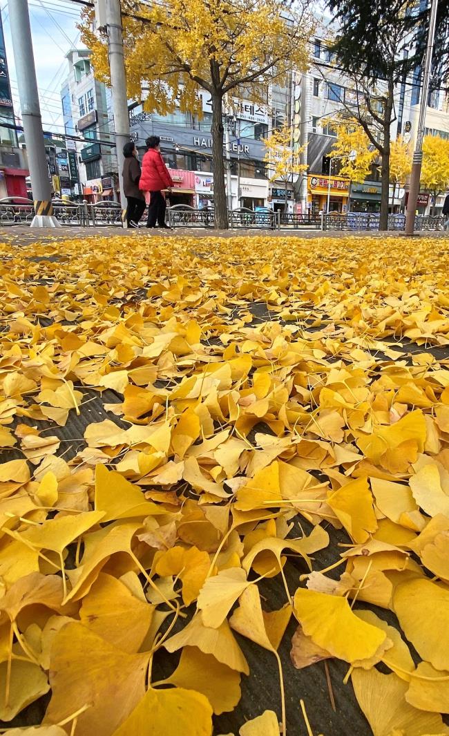 22일 오후 절기상 소설(小雪), 부산 남구 부경대학교 인근 거리에서 시민들이 낙엽 위로 걸어가고 있다.
