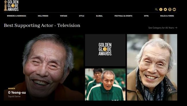 9일(현지 시각) 미국 로스앤젤레스 비벌리힐스 호텔에서 개최된 제79회 골든글로브 시상식에서 넷플릭스 화제의 드라마 ‘오징어 게임’의 원로배우 오영수가 TV 드라마 부문 남우조연상을 수상했다. 오영수는 오징어 게임에서 이른바 ‘깐부 할아버지 오일남’으로 분해 인상 깊은 연기를 펼쳤다. 골든글로브에서 한국 배우가 연기상을 품에 안은 것은 이번이 처음이다.