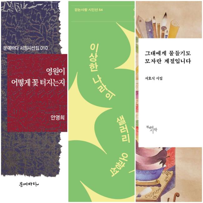 오는 4일은 절기상 입춘(立春)이다. 예로부터 이날이 봄의 시작이라 하였다. 새해가 밝은지가 엊그제 같은데 벌써 겨울이 지나고 봄을 기다리는 때가 된 것이다. 짧지만 소중했던 설 연휴를 마무리하는 오늘, 포근한 봄날을 기대하며 근간(近刊)된 시집을 읽어보자. 작년 말 발간된 《영원이 어떻게 꽃 터지는지》(안영희, 문예바다), 《이상한 나라의 샐러리》(오광석, 걷는사람)와 《그대에게 물들기도 모자란 계절입니다》(서호식, 천년의시작)를 권한다. 전통 서정미학과 미래파적 상상력을 고루 느낄 수 있다.