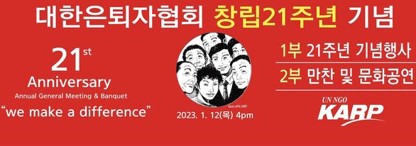 KARP대한은퇴자협회가 오는 15일 창립 21주년을 맞이한다. 2002년 1월 15일 창립한 이 단체는 새로운 은퇴 문화 발전과 노년층 권익 향상 및 세대 간 화합을 위한 활동하면서 은퇴자들을 위한 대표적인 NGO로 성장했다.