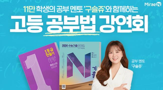 이번 고등 공부법 강연회는 미래엔의 수능 기출 문제집 ‘N기출’과 내신 기출 문제집 ‘1등급 만들기’를 토대로 구슬쥬가 추천하는 문제집 활용법과 과목별 고등 공부 비법을 소개하는 방식으로 진행된다. 또 새 학기 궁금증을 해결하는 Q&A 시간, 구슬쥬 사인회 및 사진 촬영 순서도 준비돼 있다.