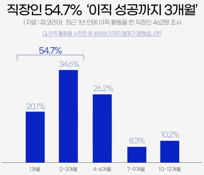 이직에 성공하기까지 걸린 기간을 살펴보면 이직 활동을 시작한 지 ‘2개월~3개월’에 성공했다는 응답자가 34.6%로 가장 많았다. 이어 △4개월~6개월(26.2%) △1개월(20.1%) 순으로 조사됐다. 누적비율로는 3개월 안에 이직에 성공한 직장인이 54.7% (1개월(20.1%)+2~3개월(34.6%))로 절반에 달했다.