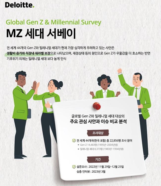 한국 딜로이트 그룹(총괄대표 홍종성)은 전 세계 44개국 MZ세대 총 2만여 명 이상(밀레니얼 세대 8373명, Z세대 1만4483명)을 대상으로 한 설문과 심층 인터뷰로 ‘딜로이트 2023 글로벌 MZ세대 서베이(Deloitte’s 2023 Gen Z and Millennial Survey)’ 국문본을 발간했다. 특히 본 조사는 한국의 MZ세대를 포함한 조사이기 때문에 국내 산업에 시사하는 바가 크다고 할 수 있다.