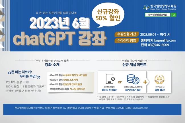 한국열린평생교육원이 오는 12일부터 챗GPT(ChatGPT) 강좌를 운영하고, 참가자들에게 혁신적인 인공지능(AI) 활용 방법을 소개한다. 이번 강좌에서는 ChatGPT를 활용해 AI 동화책 제작 및 대체불가능토큰(NFT) 발행, 유튜브 쇼츠 제작, 한달 만에 전자책 출간, 그리고 Stable Diffusion을 활용한 AI 그림 생성에 대해 실전적인 노하우를 전수한다.