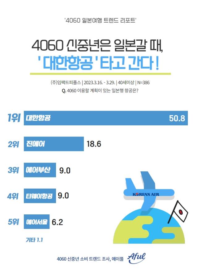 일본 여행을 계획하는 신중년 354명을 대상으로 이용 예정인 항공사를 조사한 결과 ‘대한항공’이 50.8%로 가장 높은 응답률을 보였다. 다음으로는 ‘진에어’가 18.6%로 높았다. 이어 ‘에어부산’과 ‘티웨이항공’이 9%로 동일한 응답률을 보였다.