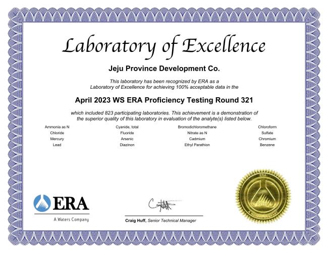 제주삼다수를 생산·판매하는 제주특별자치도개발공사가 미국 환경자원협회(ERA, Environmental Resource Associates)에서 실시한 먹는물 분야 국제숙련도 평가에서 최우수 등급(Excellence)을 받으며 5년 연속 우수 분석기관 인증을 획득했다고 20일 밝혔다.