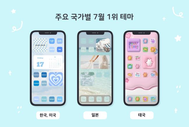 포토위젯이 공개한 7월 국가별 홈 화면 트렌드를 살펴보면 미국과 한국에서는 여름, 바다 분위기의 테마와 캐릭터 위주의 귀여운 일러스트 테마가 강세를 보였다. 다만 미국의 주요 컬러는 스카이 블루, 한국은 핑크로 나뉘어졌다. 태국에서도 아기자기한 캐릭터가 담긴 귀여운 테마가 가장 강세를 보였으며, 주요 컬러는 핑크였다.