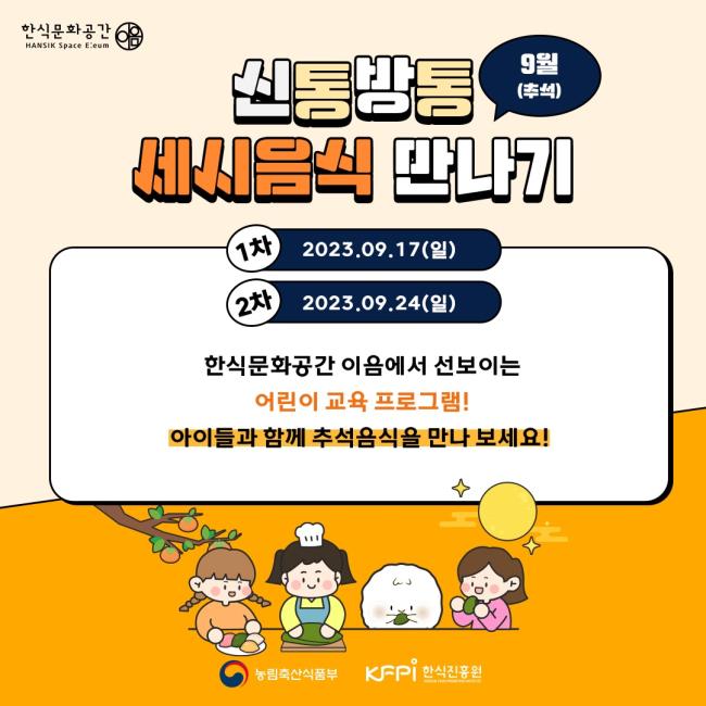 한식진흥원은 추석을 맞아 어린이 자녀와 가족이 함께 참여하는 ‘신통방통 세시음식 만나기: 추석 음식’ 클래스를 준비했다. 해당 클래스는 9월 17일와 9월 24일 두 번 열리며 가을 날씨와 농사, 옛 추석 풍경, 추석 음식 알아보기, 송편 만들기 등으로 이뤄진다. 어린이 클래스 참여 신청은 예약 페이지를 통해 가능하다. 모집인원은 회차별로 15명이며, 예약금은 5000원으로 프로그램 참여 시 환불된다.