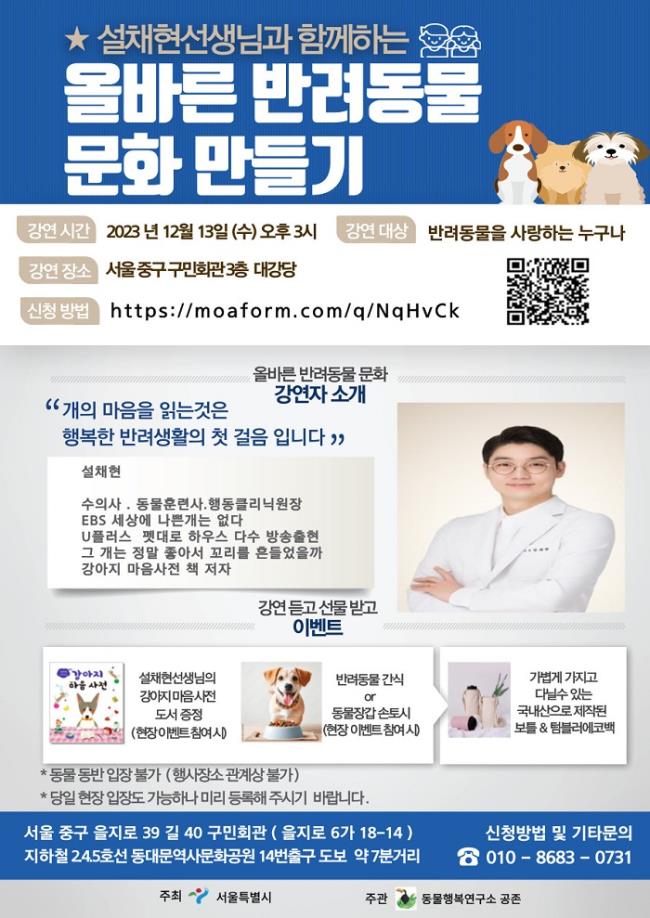 서울시가 주최하고 동물행복연구소 공존이 주관하는 이번 행사는 동물행동 전문가 설채현 수의사의 ‘올바른 반려동물 문화’ 강연을 비롯해 반려동물 사랑실천활동을 접할 수 있는 시간으로 구성됐다.