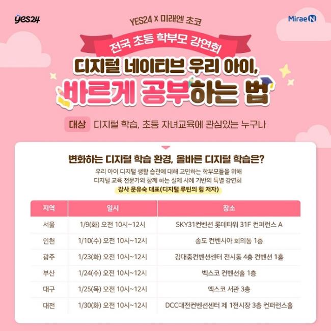 초등 전과목 온라인 학습 서비스 플랫폼 ‘미래엔초코’를 출시한 기업 미래엔이 예스24와 함께 ‘예스24 X 미래엔초코 전국 초등 학부모 강연회’를 진행한다고 4일 밝혔다.
