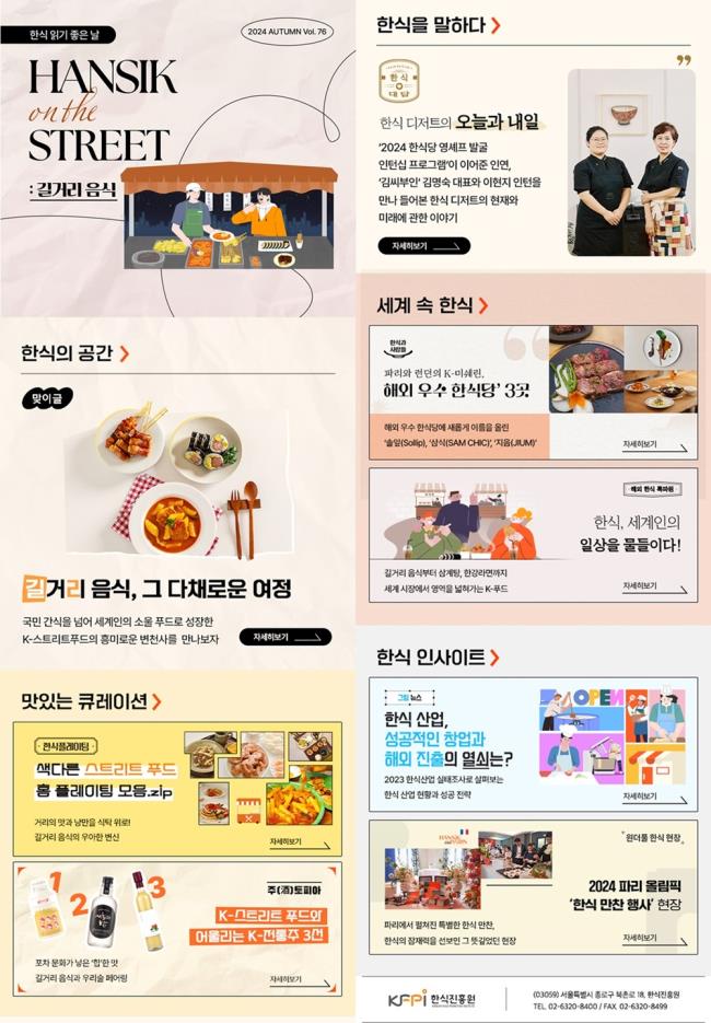 한식진흥원이 온라인 매거진 ‘한식 읽기 좋은 날’의 2024년 가을호 ‘한식 on the STREET: 길거리 음식’을 발행했다고 23일 밝혔다.