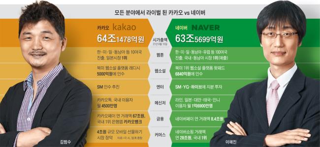 16일 《조선일보》는 친구이자 숙명의 라이벌로서 경쟁을 벌이고 있는 두 남자의 스토리를 보도했다. 두 사람은 검색과 게임이라는 다른 분야로 출발해 각자 영역에서 우위를 다져갔지만, 최근 쇼핑·금융·웹툰·웹소설 등 다양한 분야로 사업을 확장하며 국내외에서 치열한 혈투를 벌이고 있다.