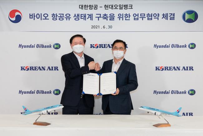 대한항공과 현대오일뱅크는 30일 오전 서울시 강서구 대한항공 본사에서 우기홍 대한항공 사장, 강달호 현대오일뱅크 사장 등 양사(兩社) 관계자들이 참석한 가운데 ‘바이오 항공유 제조 및 사용 기반 조성 협력을 위한 양해각서(MOU)’를 체결했다.