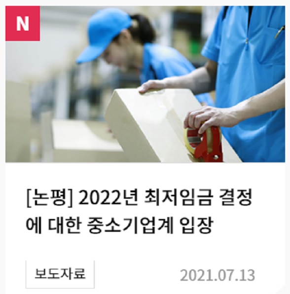 중소기업인들로 구성된 협동조합 '중소기업중앙회'가 13일 〈2022년 최저임금 결정에 대한 중소기업계 입장〉이라는 제하의 논평을 발표했다. 이 단체는 해당 논평에서 "중소기업 현장은 지난해 코로나 팬데믹 속에서도 경영난 극복과 일자리 유지를 위하여 최선을 다해왔다"며 "최소한 (최저임금) 동결 수준을 간곡히 호소했으나, 금번에 인상된 최저임금으로 현장의 충격은 불가피하다"고 우려했다. 이하 전문(全文).