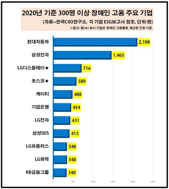 삼성전자는 장애인 직원 1465명으로 2위를 기록했다. 장애인 고용률은 1.5%였다. LG디스플레이가 716명(장애인 고용률 환산 추정)으로 3위였고, 포스코(589명 추정), KT(488명), 기업은행(454명), LG전자(431명) 등 순으로 많았다.