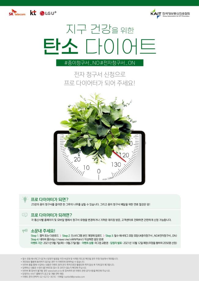 SKT와 KT, LG유플러스는 이동통신 이용 고객의 전자청구서 이용률을 높여 종이청구서 제작 및 배송 과정에서 배출되는 온실가스를 절감해 ESG 경영을 실천하고자 7일부터 한 달간 KAIT와 함께 행사를 마련하게 됐다.