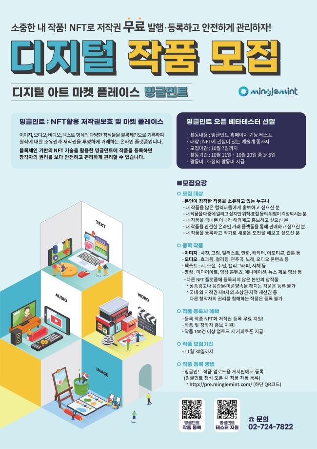 NFT(Non-Fungible-Token:대체 불가능 토큰) 기술을 기반으로 한 디지털 아트 마켓 플레이스 ‘밍글민트’에서 디지털 작품을 모집한다.