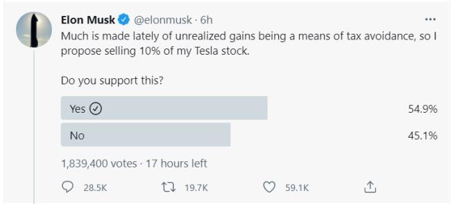 머스크는 6일(현지 시각) "최근 실현되지 않은 이익이 조세회피 수단이 되고 있다는 것과 관련해 많은 논의가 오가고 있다. 그래서 내 테슬라 주식 10%를 매각하는 방안을 제안한다"고 밝혔다. 그러면서 찬반 선택이 가능한 설문조사를 함께 첨부했다.