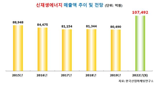 특히 2019년 한국 태양광 생산량은 2015년보다 193만 8556toe 증가했으며 △바이오(139만 6770toe 증가) △풍력(28만 7361toe 증가) △연료 전지(25만 7011toe 증가) △IGCC(21만 8376toe 증가) △수력(14만 752toe 증가)도 10만toe 이상 증가했다. 이에 따라 한국의 신재생에너지 매출액도 2015년 8조8948억원에서 2022년 10조7492억원으로 확대될 전망이다.