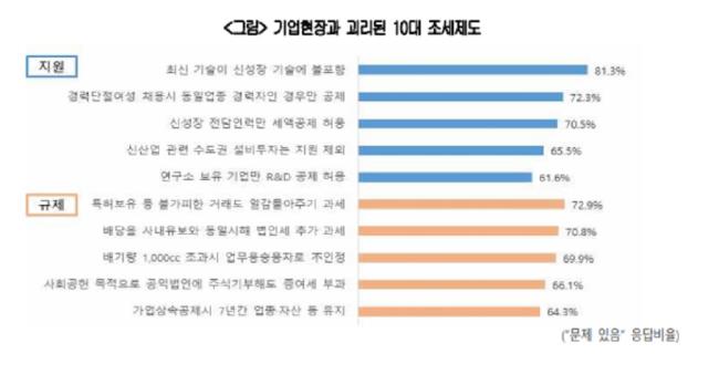 본 조사에 응답한 기업들은 활용하기 어려운 조세 지원 제도의 예로 ▲경력 단절 여성 채용 시 동일 업종 경력자인 경우만 공제(72.3%) ▲신산업 인프라 구축 등 전국적 투자가 필요한 경우도 수도권 설비 투자는 지원 제외(65.5%) ▲연구소를 보유한 기업에만 R&D 공제를 해줘 연구소가 불필요한 서비스업 등에 불리(61.6%) 등을 꼽았다.