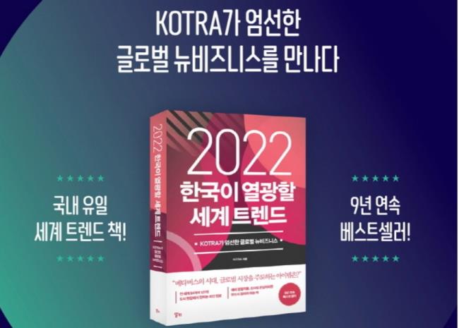 대한무역투자진흥공사(KOTRA)가 미래 사회를 선도할 글로벌 뉴 비즈니스 사례를 분석한 책 《2022 한국이 열광할 세계 트렌드》(알키)를 펴냈다. 편집부는 “세계 시장에서 포착한 36개의 성공 비즈니스 사례를 담았다. 비즈니스 맨은 물론 예비 기업가, 전 세계 다양한 문화와 사람들의 삶 속에서 ‘내 일’을 찾길 원하는 학생까지, ‘기회를 선점하길 바라는 이들’을 위해 준비된 책”이라며 “KOTRA 전 세계 84개국, 127개 무역관 직원들이 찾아낸 뜨거운 시장, 상품, 서비스를 담아냈다. 수백 명의 주재원들이 지구촌 곳곳에서 직접 눈으로 목격하고 취재한 검증된 비즈니스들을 만나볼 수 있는 책”이라고 밝혔다.