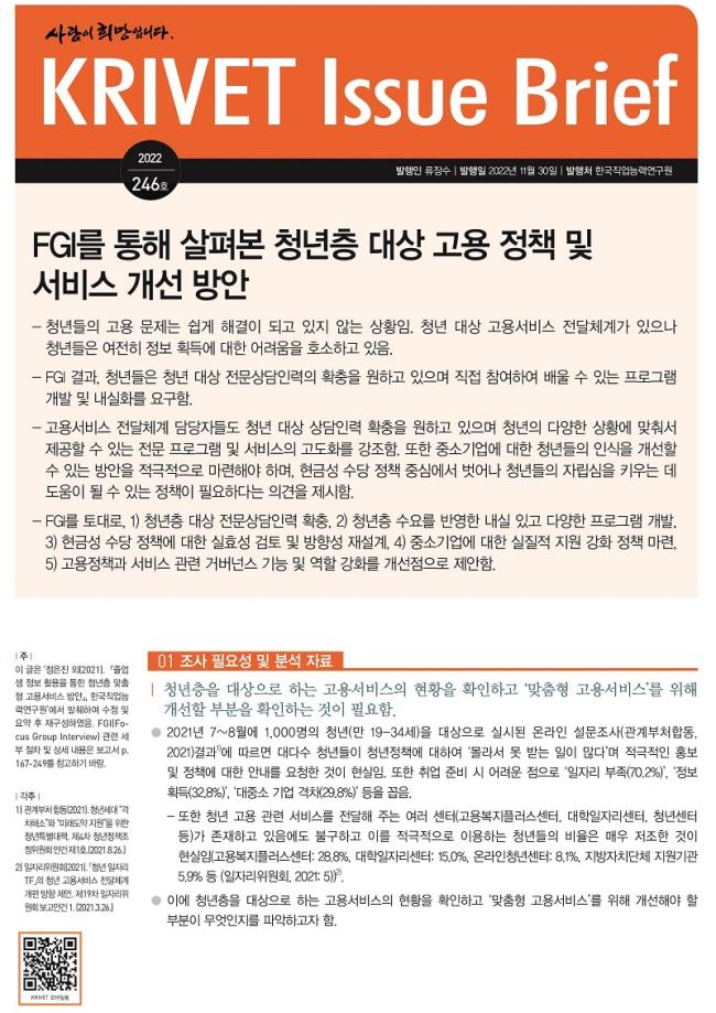 해당 보고서에 게재된 ‘FGI를 통해 살펴본 청년층 대상 고용 정책 및 서비스 개선 방안’에 따르면, 청년들이 지적하는 주된 문제점은 청년 고용 정책 및 서비스에 대해 인지도가 낮다는 사실이다.