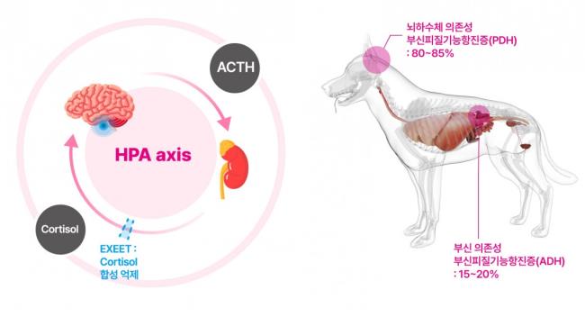 쿠싱증후군(Cushing’s Syndrome)이란 부신에서 분비되는 코르티솔(Cortisol) 분비가 비정상적으로 높아져 발생하는 질병을 말한다. 이 질병은 크게 ‘뇌하수체 의존성 부신피질기능항진증(PDH)’과 ‘부신 의존성 부신피질기능항진증(ADH)’으로 구분된다. 반려견에서는 주로 뇌하수체의 원인(~80%)으로 발생하는데, 시상하부-뇌하수체 전엽-부신으로 이어지는 HPA axis의 내분비계 이상으로 코르티솔이 과다 분비돼 문제가 된다.