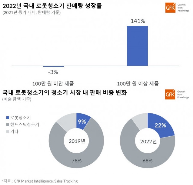GfK는 “기존 로봇 청소기보다 많게는 2배 이상 비싼 제품들임에도 청소에 걸리는 시간과 노동에서 더 자유로워질 수 있도록 하는 하이엔드 기능을 원하는 소비자층이 확대되면서 높은 판매 성장을 보였다고 평가했다. 실제로 지난해 100만 원 미만의 제품의 판매 수량은 3% 감소했지만, 100만 원 이상 프리미엄 제품의 판매는 141% 증가하며 로봇 청소기 시장의 성장을 이끌었다.