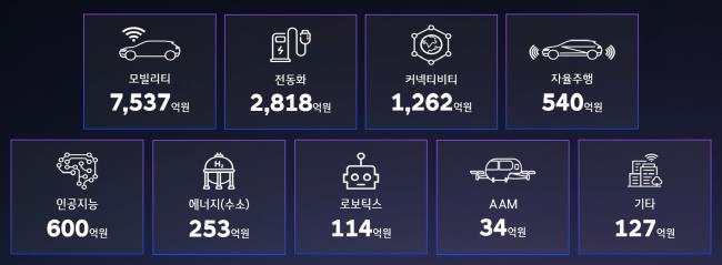 분야별로 보면 모빌리티 분야가 7537억원으로 가장 많고, 전동화 2818억원, 커넥티비티 1262억원, 인공지능 600억원, 자율주행 540억원, 에너지(수소 포함) 253억원 등이다.