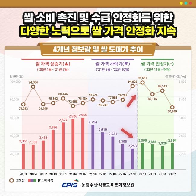 2021년 7월 쌀 도매가가 ㎏당 2955원까지 크게 오르며 정점을 찍은 뒤 2022년 10월까지 가격 하락이 이어졌다. 이에 대응하기 위한 정부의 전략작물직불제도, 가루쌀 산업 활성화 대책 등이 발표되며 온라인 언급량은 2022년 11월 9만8667건으로 최대치를 기록했다. 이후 쌀 소비량 감소세에 제동이 걸리며 쌀 가격은 안정세에 들어섰다.